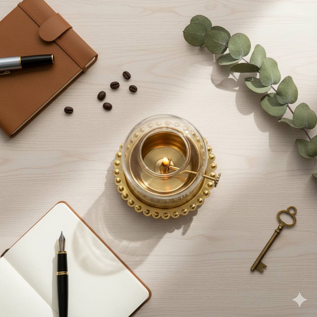 Bring divine light and positivity to your home with this Brass Akhand Diya. Crafted from premium quality brass, this diya is designed to keep the flame glowing continuously during prayers and rituals. Its protective glass cover ensures the flame stays lit without disturbance, symbolizing eternal energy and prosperity. Perfect for daily puja, meditation, Navratri, Diwali, and festive rituals, this diya adds spiritual charm and traditional beauty to your space.